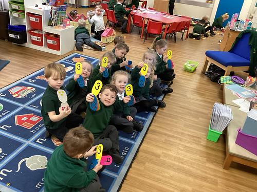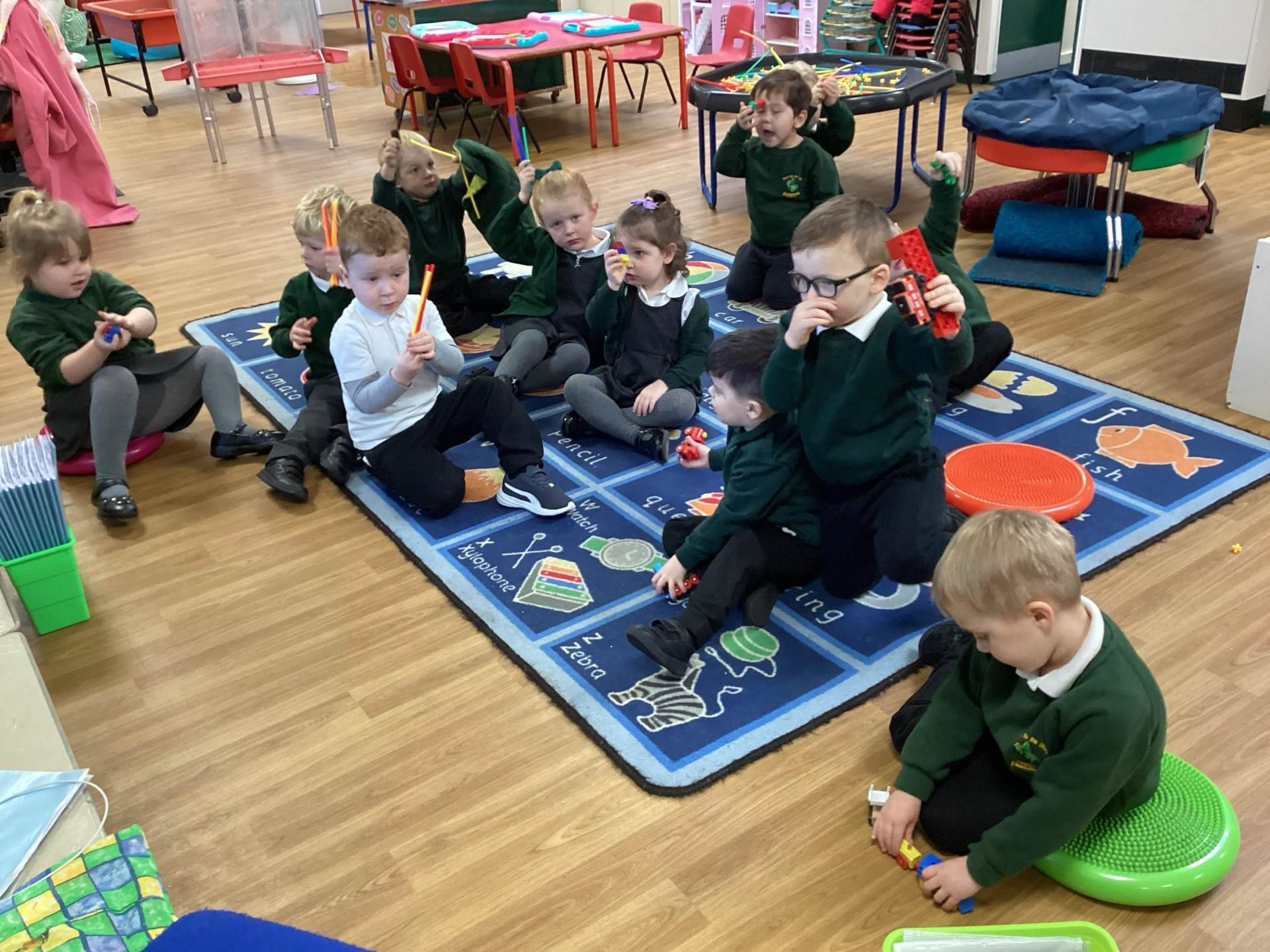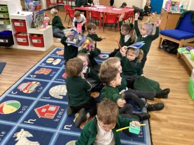 Every week the children learn a nursery rhyme and build up their repertoire of songs. They then build on this by listening to sounds, making voice sounds, rhyming, odd one out and alliteration games.