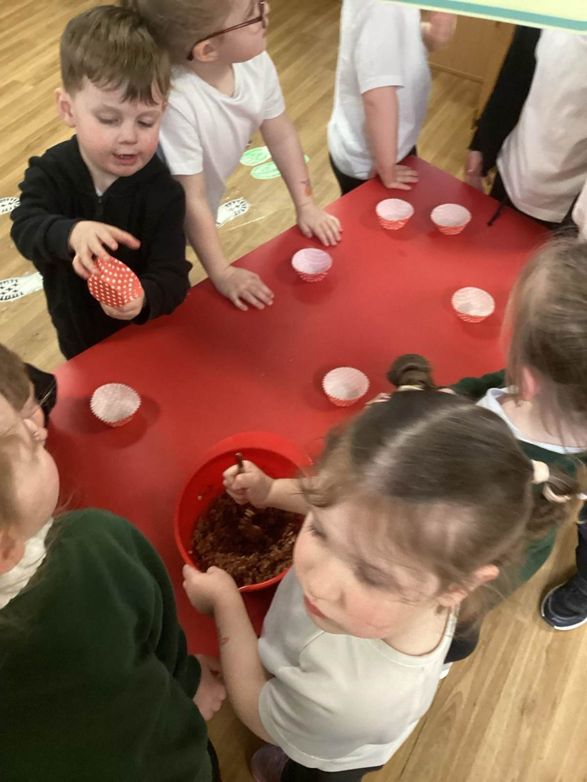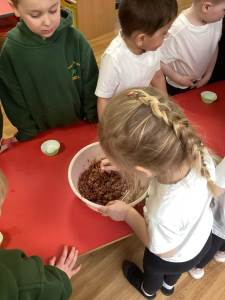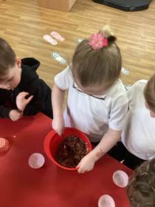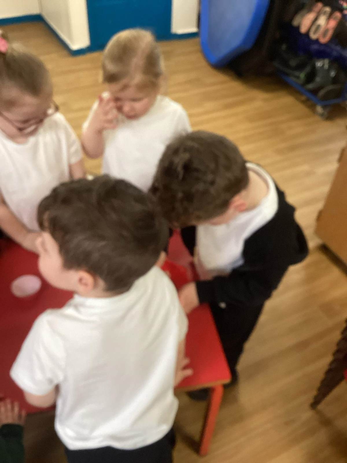 Every week the children learn a nursery rhyme and build up their repertoire of songs. They then build on this by listening to sounds, making voice sounds, rhyming, odd one out and alliteration games.