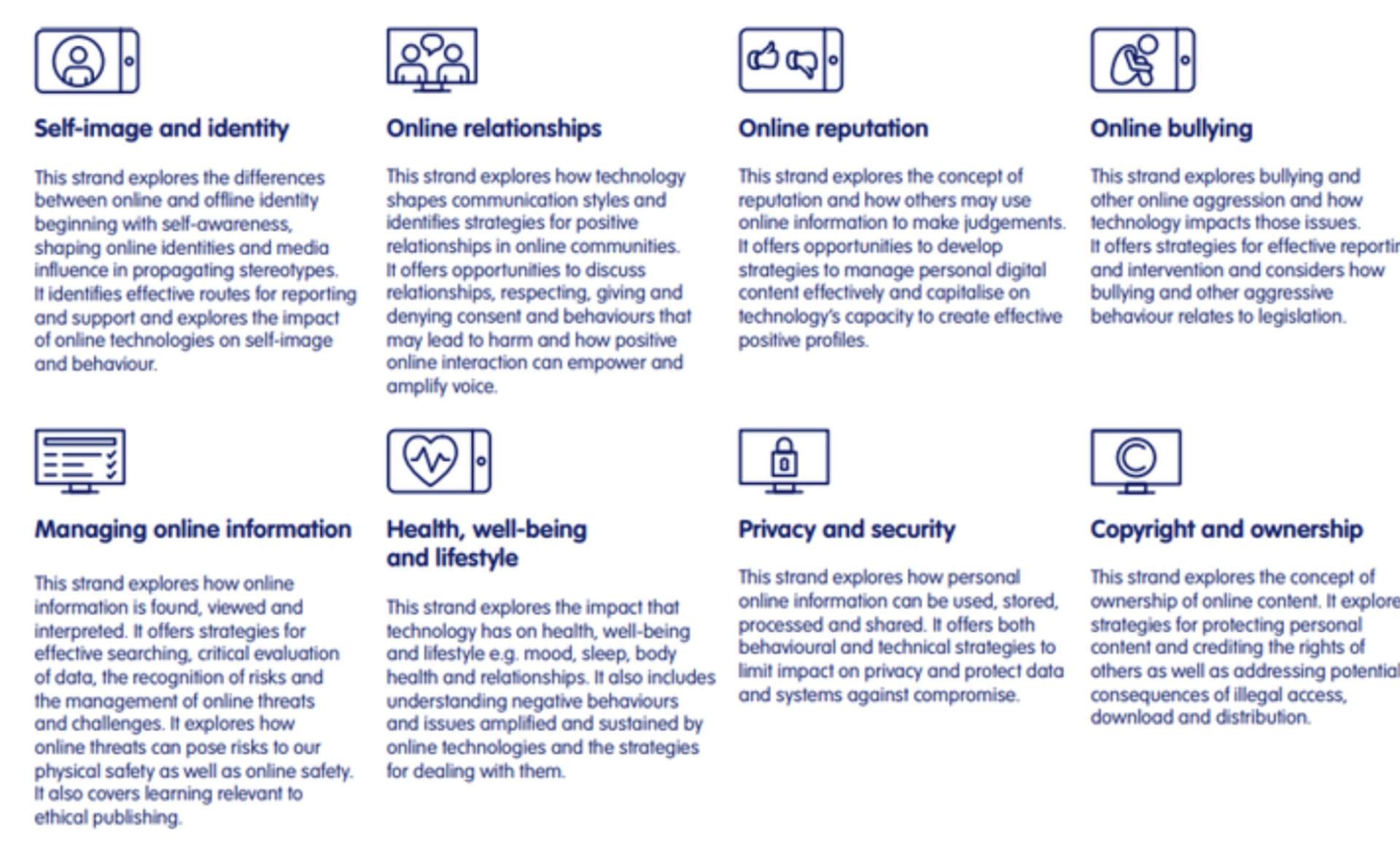 This aspect of learning is taught discretely or, when relevant and effective to do so, it is woven into our computing, PSHE and wider curriculum. The framework works across all year groups and describes the knowledge, understanding and skills that children and young people should have the opportunity to develop throughout their time at Holly Grove Primary Academy and beyond.