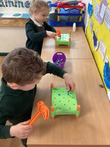 Every week the children learn a nursery rhyme and build up their repertoire of songs. They then build on this by listening to sounds, making voice sounds, rhyming, odd one out and alliteration games.
