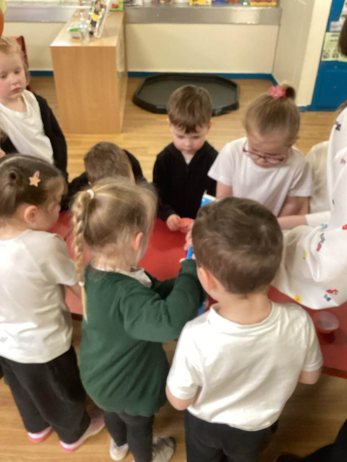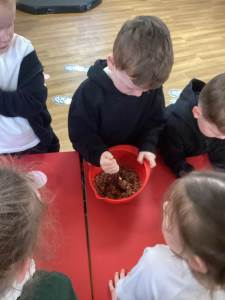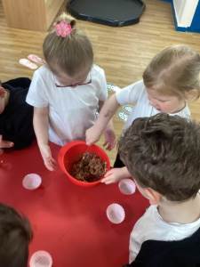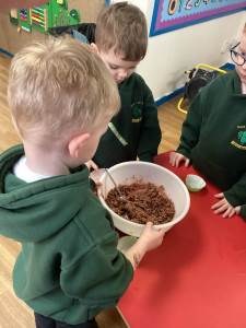Every week the children learn a nursery rhyme and build up their repertoire of songs. They then build on this by listening to sounds, making voice sounds, rhyming, odd one out and alliteration games.