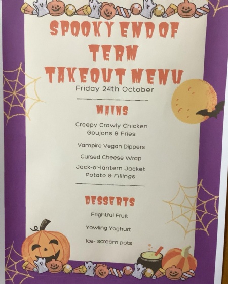 On Friday 24th October we have a special Spooky End of Term menu!!! and the Kitchen are also having a bake sale of Halloween Pumpkin shortbread! They are dairy free and perfect for decorating at home with the children. 40p each of 3 for £1.