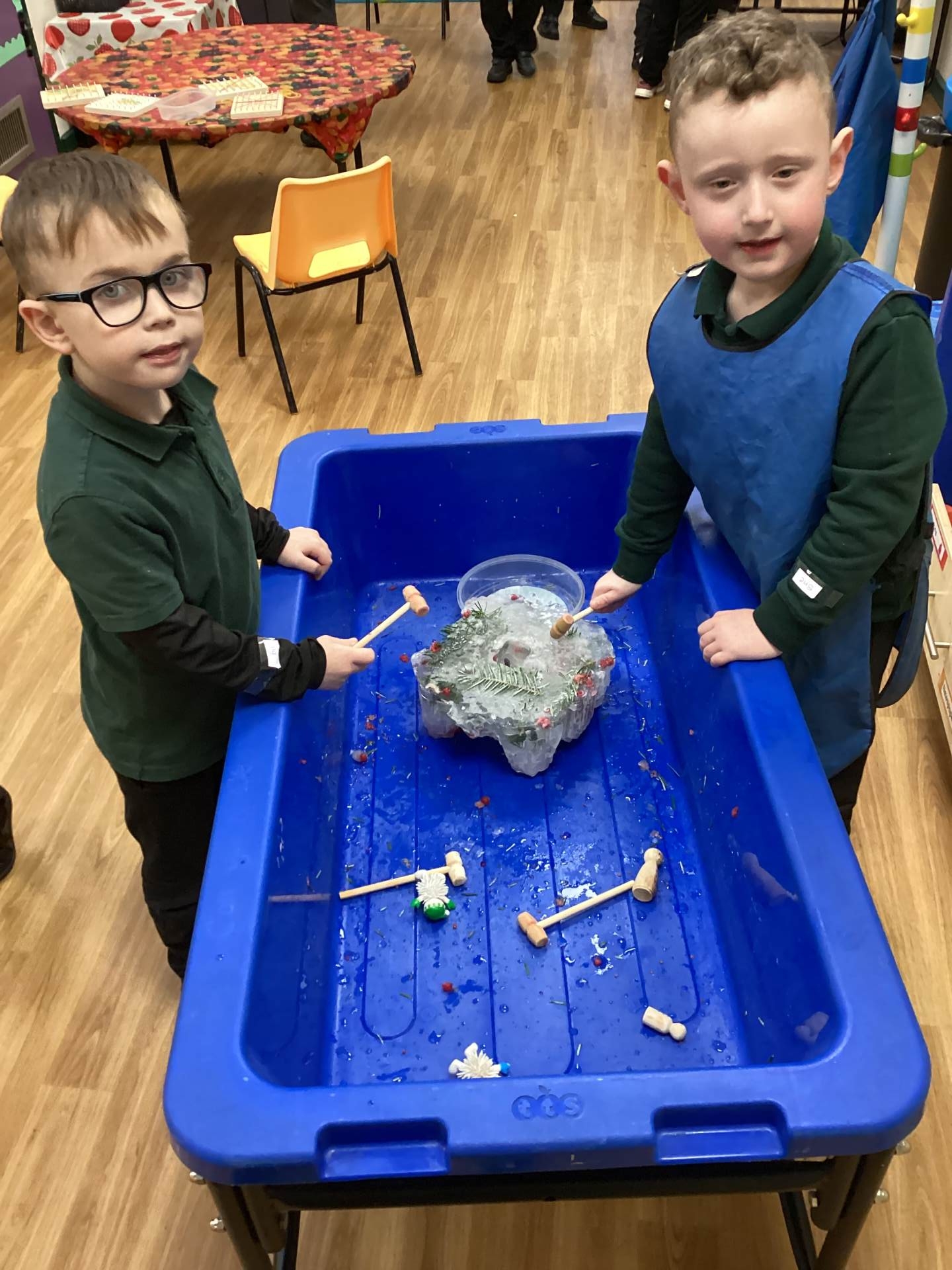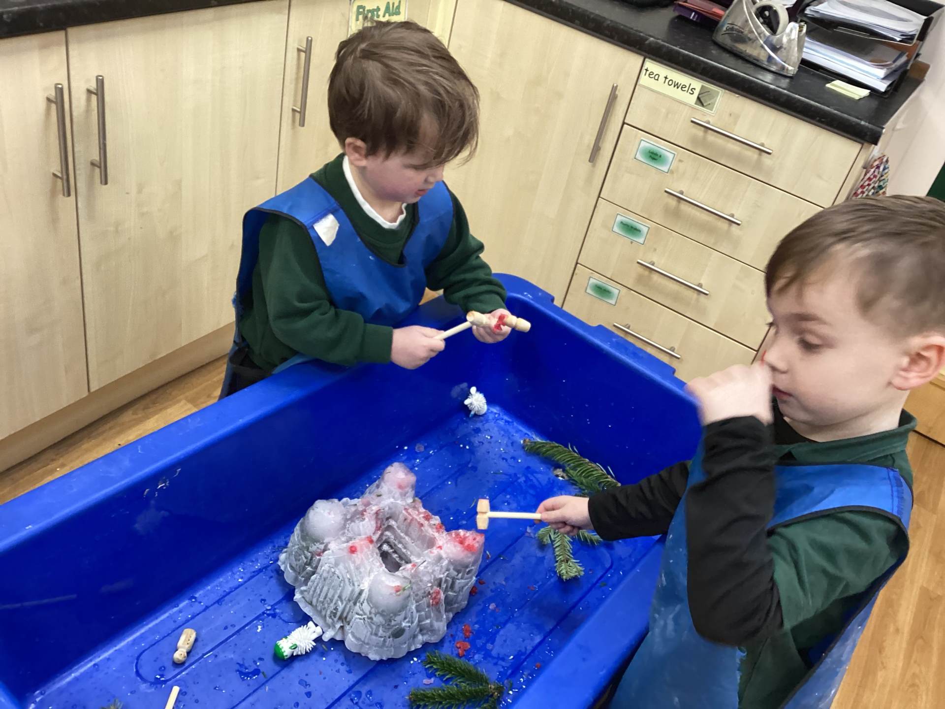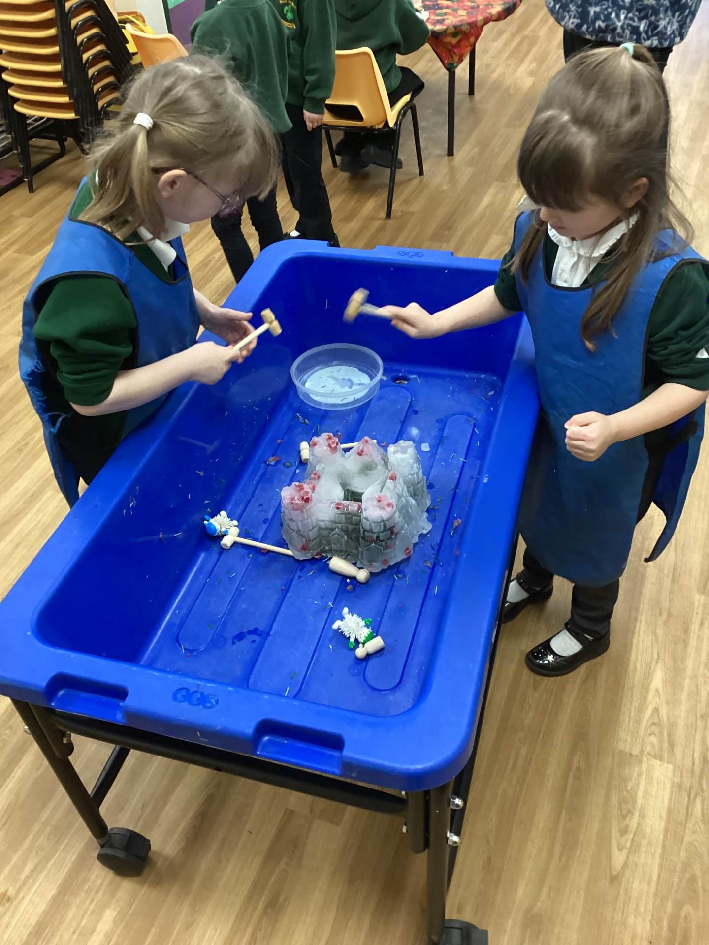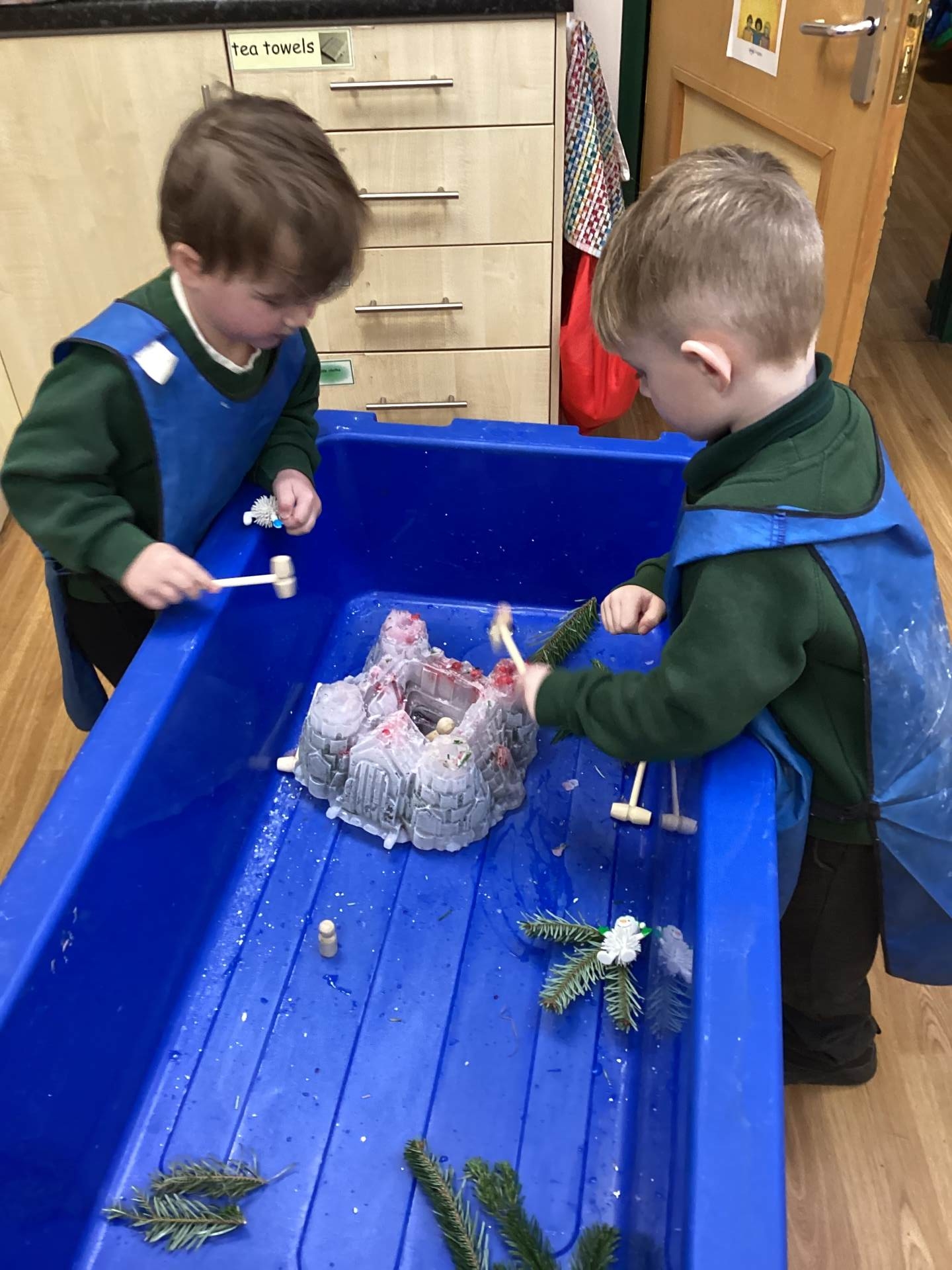 Throughout continuous provision, the children worked incredibly hard using their fine motor skills and hand–eye coordination to chip, break and explore the icy textures. They experimented together to see which parts of the ice castle they could break off, discussing their ideas and sharing their thoughts along the way. This led to plenty of rich communication and language as the children described what they could see, feel and hear.