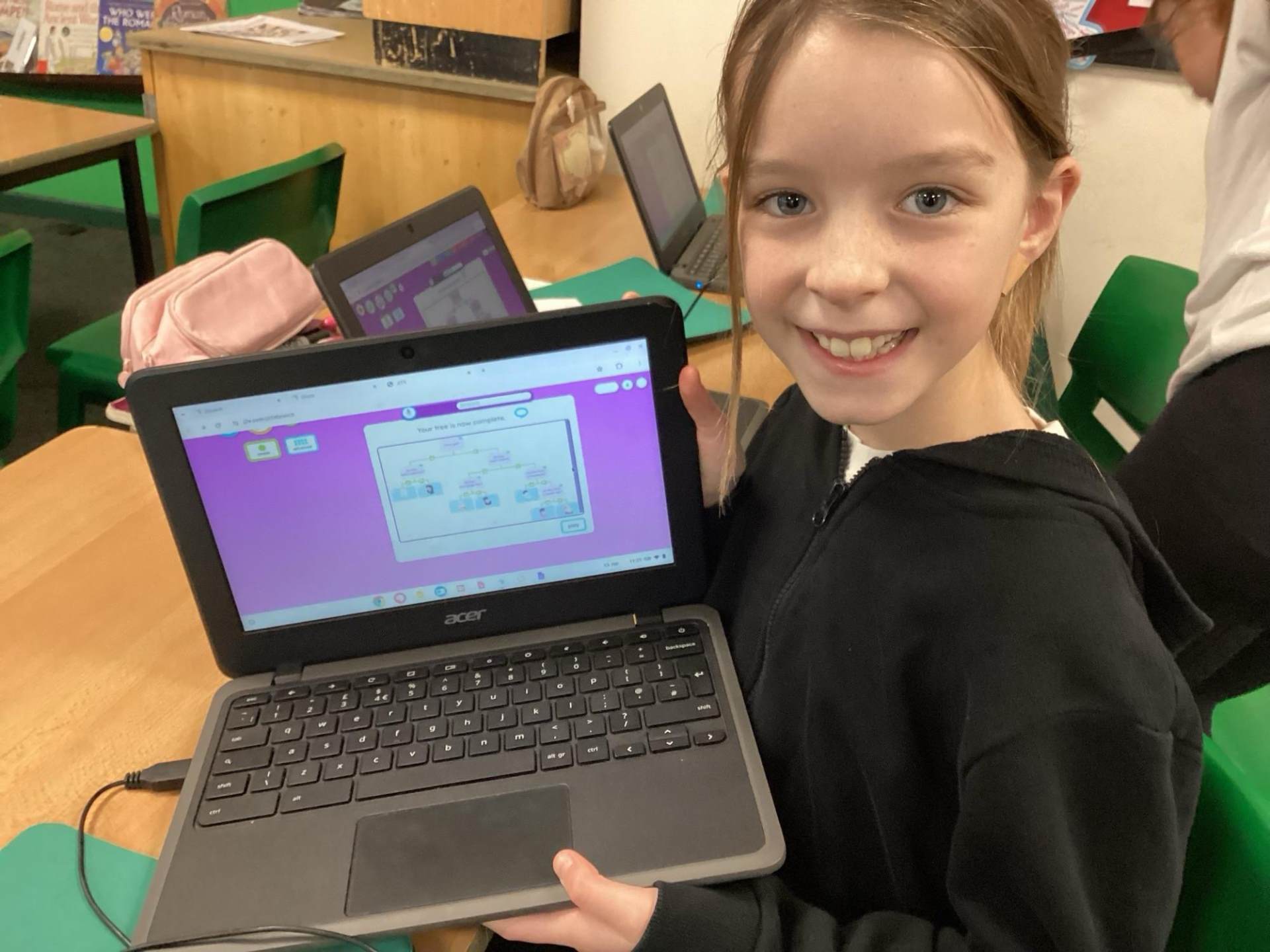 What made this lesson truly valuable was the range of skills the children were developing without even realising it. Creating a branching database encourages pupils to think logically and step-by-step, helping them understand how computers make decisions—an essential foundation for future coding and problem‑solving. At the same time, they had to communicate clearly and precisely, choosing questions that avoided confusion while still narrowing down the options. Their teamwork shone throughout, as groups negotiated, reasoned and adapted ideas together. As they worked, they were also becoming more digitally literate, learning how information is organised in the technological world around them.